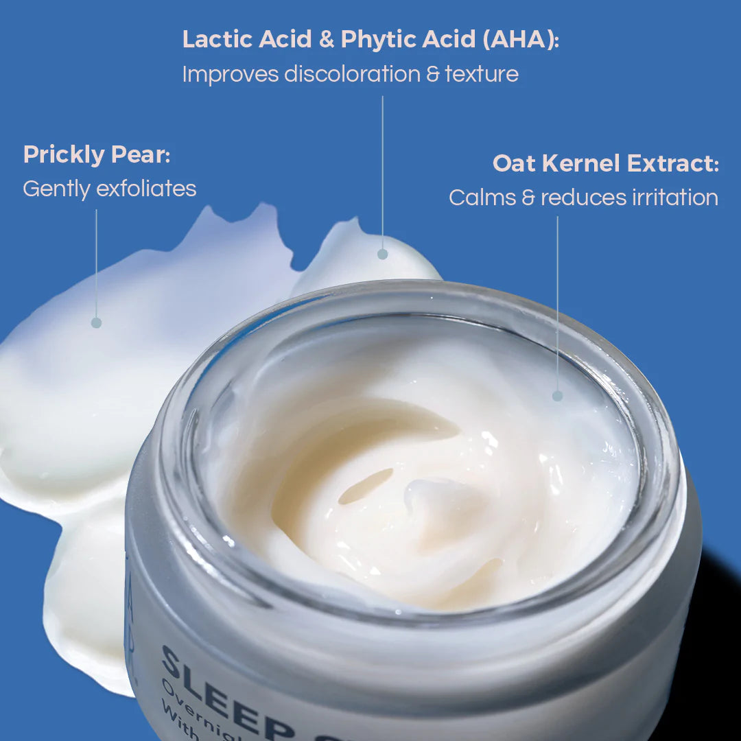 An overnight brightening treatment with a skin friendly blend of alpha hydroxy acids (AHAs) and prickly pear to visibly improve appearance of dark spots and acne scars, target fine lines and refine skin texture. Provides gentle exfoliation with calming oat extract for a smooth and even complexion. Recommended for all skin types.